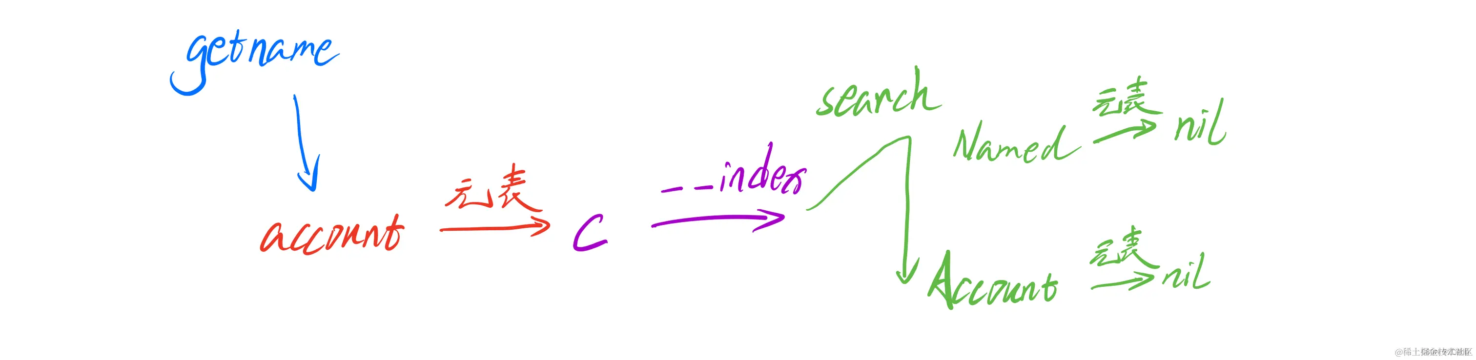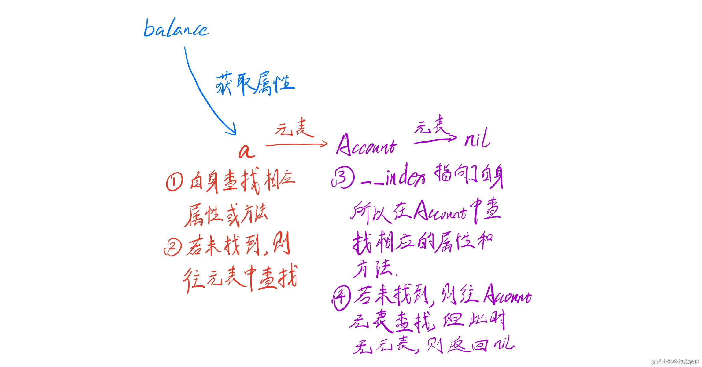 换而言之,我们通过元表的方式,让 Lua 的实例对象在找不到对应的属性或方法时,从其元表的 __index 属性指定的表(即上面所说的原型,其实他也是实例对象)或方法中获取,而如果这里指定的表也没有对应的属性,则继续往该表(也就是原型)的元表继续查找,直到查找到或全部查找完还没有找到对应的属性或方法为止。