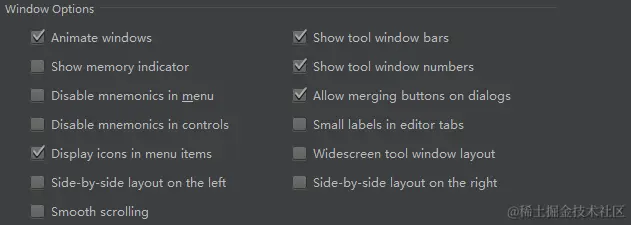 | 左侧/右侧并排布局 | 选中这些复选框后,工具窗口的位置将针对宽屏幕显示进行优化。并排布局为OFF:Ctrl+MouseClick 工具窗口之间的分离器切换布局。这只适用于位于左侧和右侧的工具窗口,但不适用于IntelliJ IDEA窗口的顶部和底部。 |