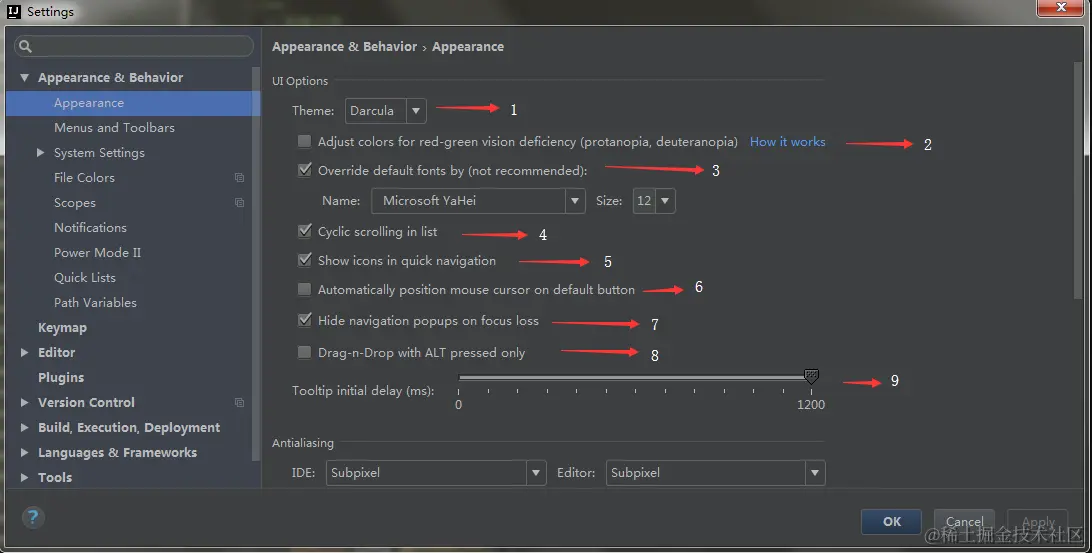 | IDE | 从此下拉列表中,选择要应用于IDE的Antialising模式(包括菜单,工具窗口等):- 子像素:建议在液晶显示器上使用此选项,并利用彩色液晶显示屏上的每个像素由红色,绿色和蓝色子像素组成的事实。这允许平滑文本并使其更详细地呈现。 - 灰度:建议将此选项用于垂直放置的非LCD显示器或显示器。它处理像素级别的文本。- 没有抗锯齿功能:这个选项可以用于高分辨率显示,非抗锯齿字体渲染速度更快,看起来更好。 |