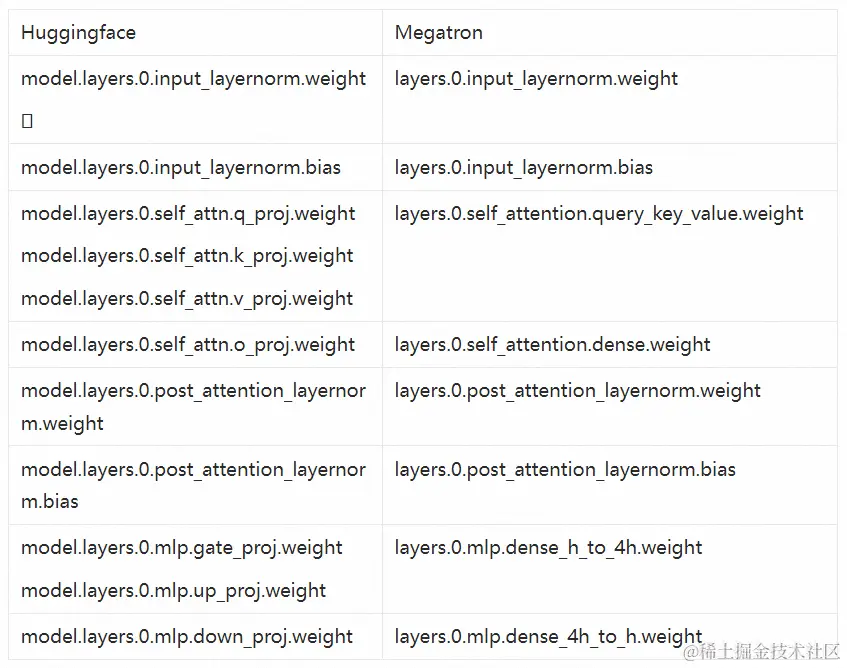 下面我们以llama-2为例,详解从huggingface到megatron的模型权重转换技术。下表总结了两者在不同module上的命名对应关系。在patch实现过程中,我们首先将HF格式的ckpt转换到一种内部格式,然后再把这种内部格式转换成对应的外部格式。这样做可以最大程度复用已有的转换逻辑来处理新模型。在转换为内部格式的过程中,q_proj, k_proj, v_proj需要沿着第0维拼接在一起后赋值给内部变量query_key_value。