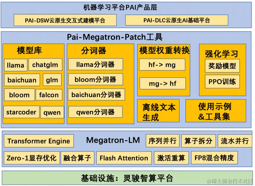 Pai-Megatron-Patch工具是阿里云机器学习平台PAI算法团队研发,基于阿里云智算服务PAI-灵骏平台的大模型最佳实践解决方案配套工具,旨在帮助大模型开发者快速上手灵骏产品,完成大语言模型(LLM)的高效分布式训练,有监督指令微调,模型离线推理验证等完整大模型开发链路。该项目提供了业界主流开源大模型基于Megatron-LM的训练&离线推理验证流程,方便用户快速上手大模型训练。