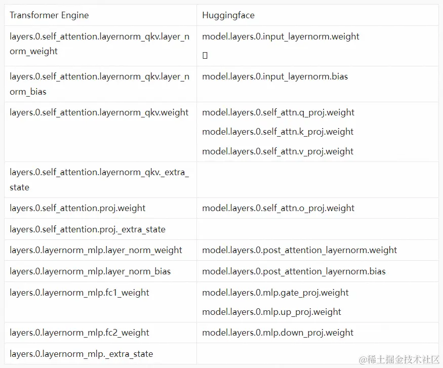 从Huggingface到TE模型的权重转换技术和之前是类似的,也需要事先找到两者之间的映射关系。从下表可以看出,TE中多了_extra_state是用来存fp8训练的scale和history的,这些在加载的时候会出现冲突,这时只要将load_state_dict函数的strict设置成False就可以了,比如load_state_dict(state_dict_, strict=False)。