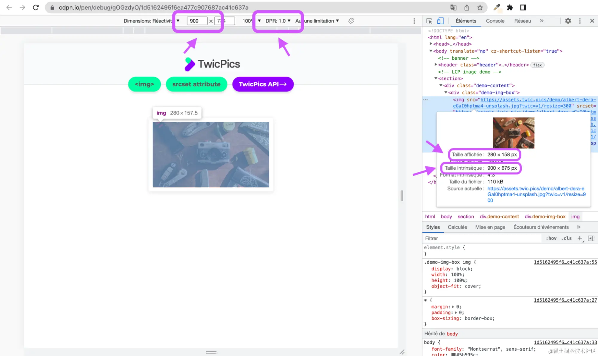下面的介绍我们将通过一个示例来进行说明。文章中在Codepen演示中使用的图片将集成TwicPics,以节省创建时间并加快LCP指标的优化。