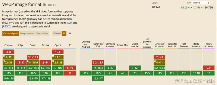 WebP 的高效压缩和快速加载速度,使其成为网页设计的理想格式。WebP 广泛应用于许多网站和应用程序中,包括 Google Chrome 浏览器、YouTube、Facebook、Pinterest 和 WordPress 等。虽然前几年有部分浏览器不支持 WebP,到了今天,除了已经退休的 IE 浏览器,基本上浏览器都已经开放支持 WebP。