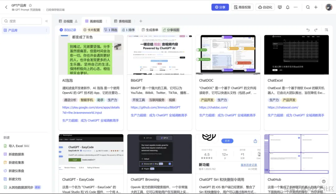 随着 GPT 的迅速传播,与其相关的各种应用、插件和服务也在短短的几个月开始快速涌现,特别是现在也有很多可以方便使用的国产 GPT 大模型,极大降低了使用的门槛。为了帮助大家更好地使用和掌握 GPT,给大家带来更深入的体验,我最近专门写了一个关于如何根据不同需求自己动手写出最好的 Prompt,并能够用 GPT 解决非常复杂以及困难的实际问题的付费教程,并且为了这个教程,我体验了大量的 GPT 相关的模型、插件、应用、服务等产品,甚至建立了一个专门的数据库来记录它们。
