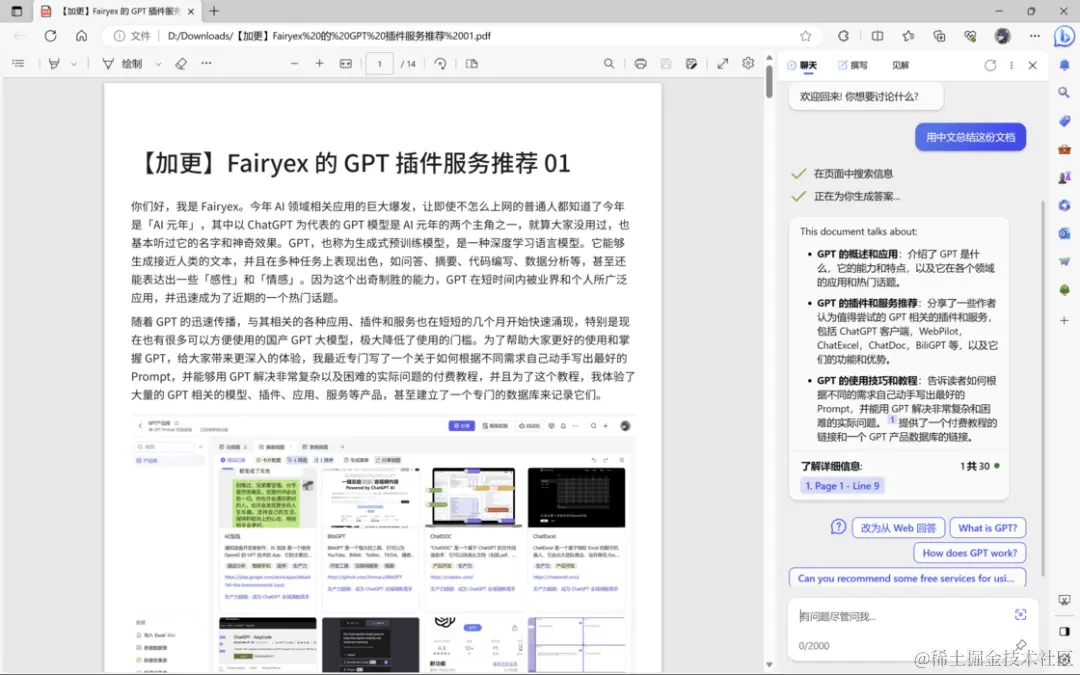 而现在微软的 NewBing 已经全量开放,我们只需要保证自己在微软的服务范围里,然后使用自带的 Edge 浏览器打开 PDF(Edge 浏览器本身也是一个优秀的 PDF 阅读软件),接着直接点击浏览器右上角的 NewBing 按钮就能在侧边栏打开一个对话窗口,并且会自动总结出文档的内容。接下来你就可以直接跟文档进行对话了。