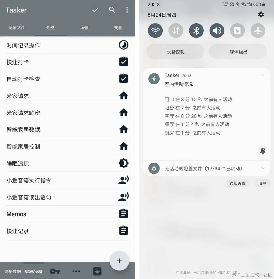 重点是这些操作可以自己配置的,你可以混合手动创建自动化任务和 GPT 的方式来实现更高效、更复杂,甚至之前没办法实现的自动化效果。比如我就做了一系列米家相关的自动化操作,然后导入对应的 Tasker GPT 任务之后就可以实现让 GPT 根据你的提问去执行对应的智能家居自动化。
