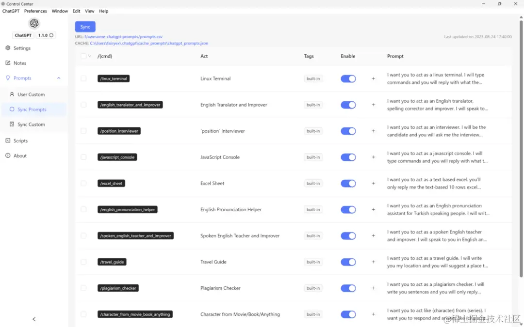 常用 Prompt 库:虽然我自己不常用这个功能,但很多人使用 ChatGPT 客户端,就是冲着能够保存自己常用的 Prompt 去的。lencx/ChatGPT 提供了一个 Prompt 管理界面,在这里你可以一键同步最新的好用 Prompt,也可以添加一些你自己的自定义 Prompt,然后在网页的输入框里,输入 /[你定义的关键词]就可以直接快速调用这些 Prompt,Prompt 可以随时修改禁用。