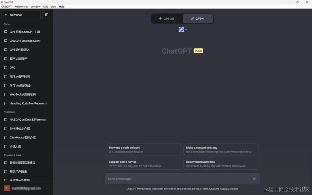 导出聊天记录:可以将 ChatGPT 的聊天记录导出为 PNG、PDF 和 Markdown 格式。不管是分享给别人,还是下载 GPT 生成的代码文档内容都很方便。这也是我在客户端上最常用的功能,不过对话过长的时候 PNG 截长图容易卡死,这就是网页套壳的弊端。