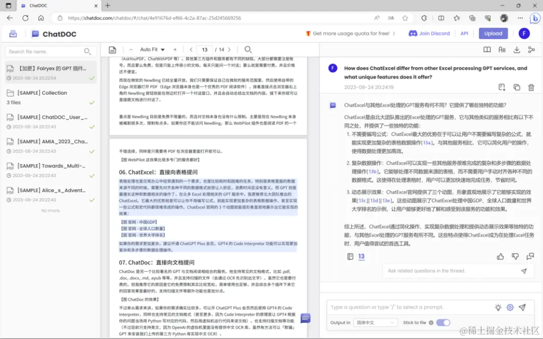 ChatDoc 是另一个比较著名的 GPT 与文档阅读相结合的服务。他支持常见的文档格式,比如 .pdf, .doc, .docx, .md, .epub 等等,并且支持扫描的文件(会通过 OCR 先识别出文字),虽然它也是要付费的,但我推荐它的原因是它的免费限制其实比较宽松,简单使用也足够,并且综合多个插件下来它的回答效果是最好的,支持扫描文件等额外功能也是加分点。