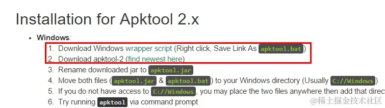 按照图中1、2两条的提示,下载apktool.bat和apktool.jar这两个文件,目前最新的apktool是2.1.1,并放到同一文件夹: