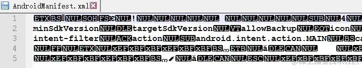 那资源文件呢,再回头看一下刚才apk文件对应的解压缩文件,所有的xml文件都是乱码,例如AndroidManifest.xml: