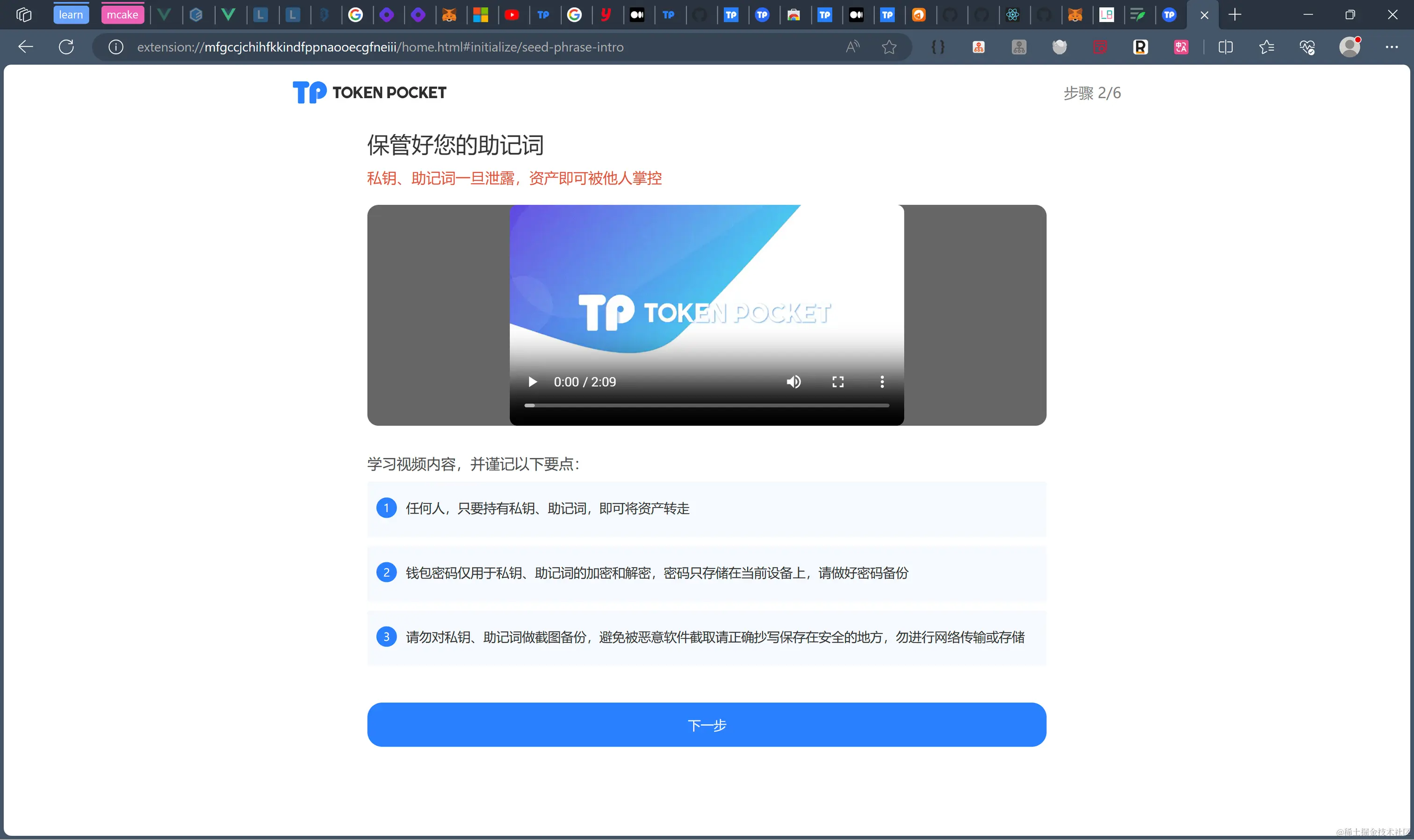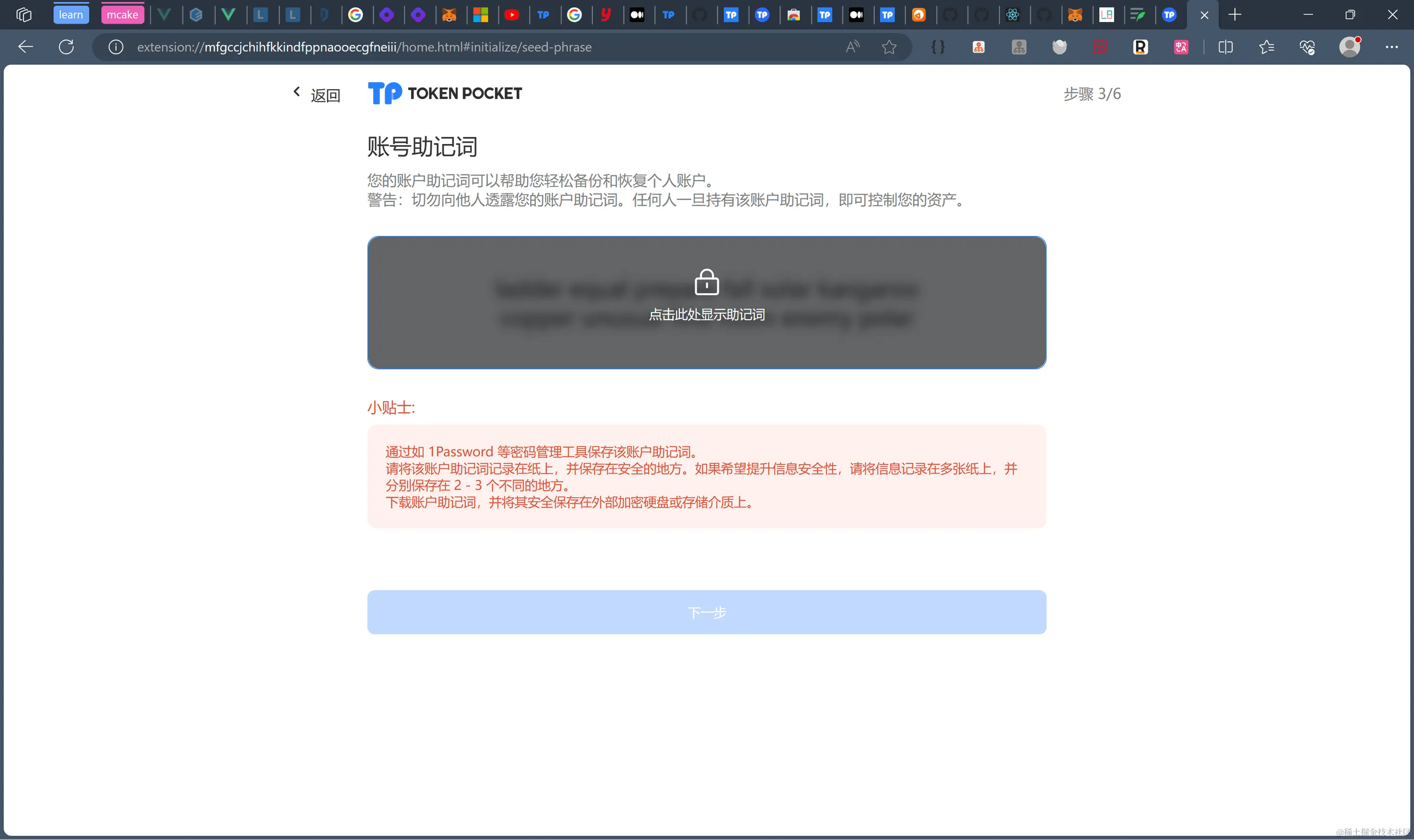 6、点击显示助记词,将其保存在一个安全的地方,然后点击下一步