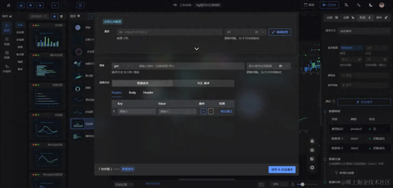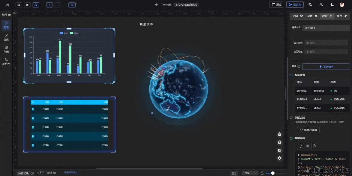 在数据源方面,LeaRun低代码开发框架可通过API可接入多种数据源平台,包括本地数据、网站统计、广告推广等第三方平台数据,方便数据统一管理。用户如需修改动态数据,在创建完接口后在数据大屏的组件的数据页签中进行调用接口,图表就获得了接口返回的数据,自动进行刷新渲染。