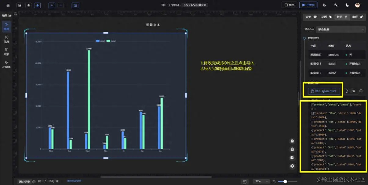 如若用户需要修改静态数据,只需要选中图表组件,选择右侧的组件数据页签,下载静态数据中的模板数据,然后在本地进行修改后再导入即可。