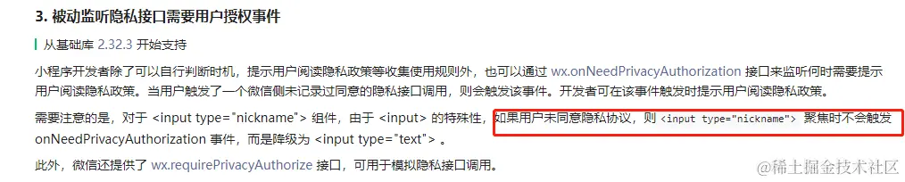 由于用户昵称填写使用的是 input 组件,是不会触发上述的隐私事件监听事件的,需要用到主动查询 wx.getPrivacySetting,这部分就不写了,比较简单。