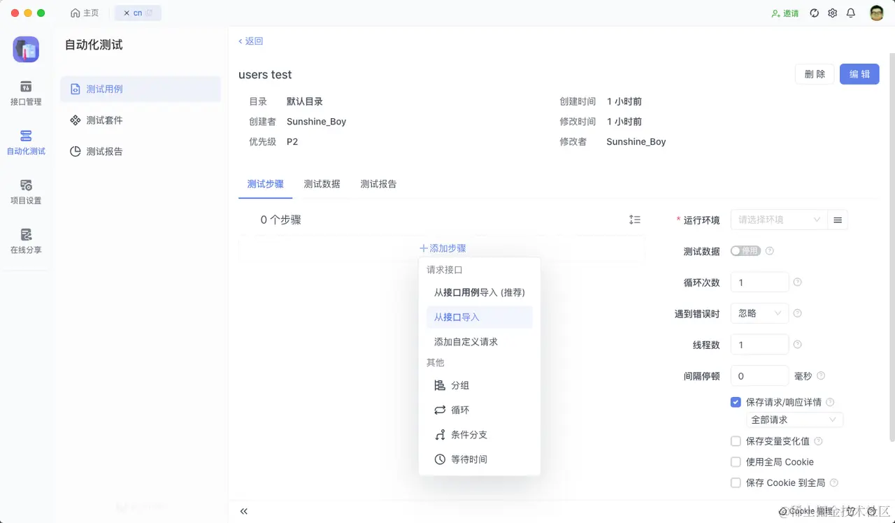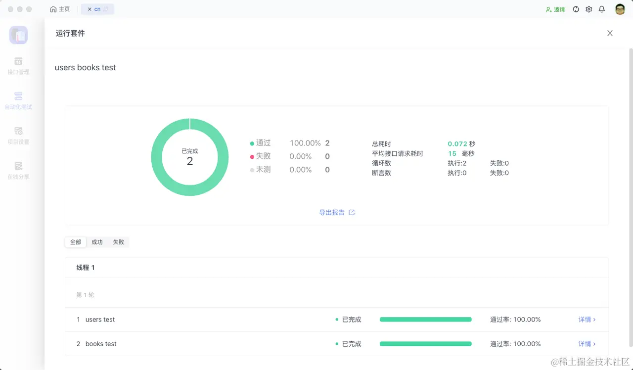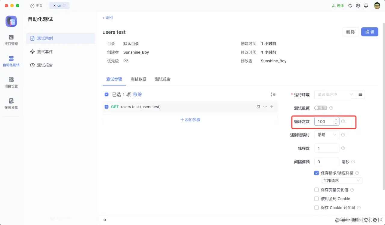 我准备两个接口,每个接口我想运行 100 次,但是我不想这两个接口混在一起 测试,所以我可以用到 Apifox 的 测试套件(Test Suit)
