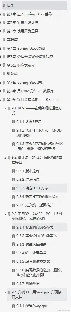RESTful是非常流行的架构设计风格。本章首先介绍REST的特征、HTTP方法与CRUD动作映射;然后讲解如何基于Spring Boot为PC、手机APP构建统- -风格的Restful API; 最后讲解在Spring Boot下如何使用RestTemplate发送GET、POST、DELETE、PUT等请求。