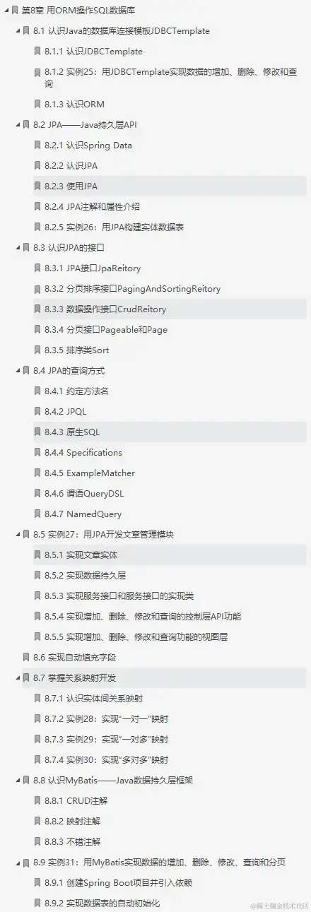 介绍如何使用ORM ( JPA、MyBatis )操作数据库;然后讲解常用的查询方式、自定义查询方式、原生SQL (Structured Query Language,结构化查询语言)的开发和映射,还会深入地讲解一对一、-对多、多对多的关系映射操作以及事务的使用;最后对比分析JPA和MyBatis的区别。