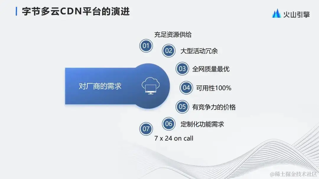 上述就是整个多云CDN产品的演进过程。火山引擎多云CDN产品在去年上线,目前还在快速地迭代过程中。我们期望和我们的厂商、开发者一起,为火山引擎的用户,实现一个规范、统一、安全、高效、智能的多云流量管理平台。