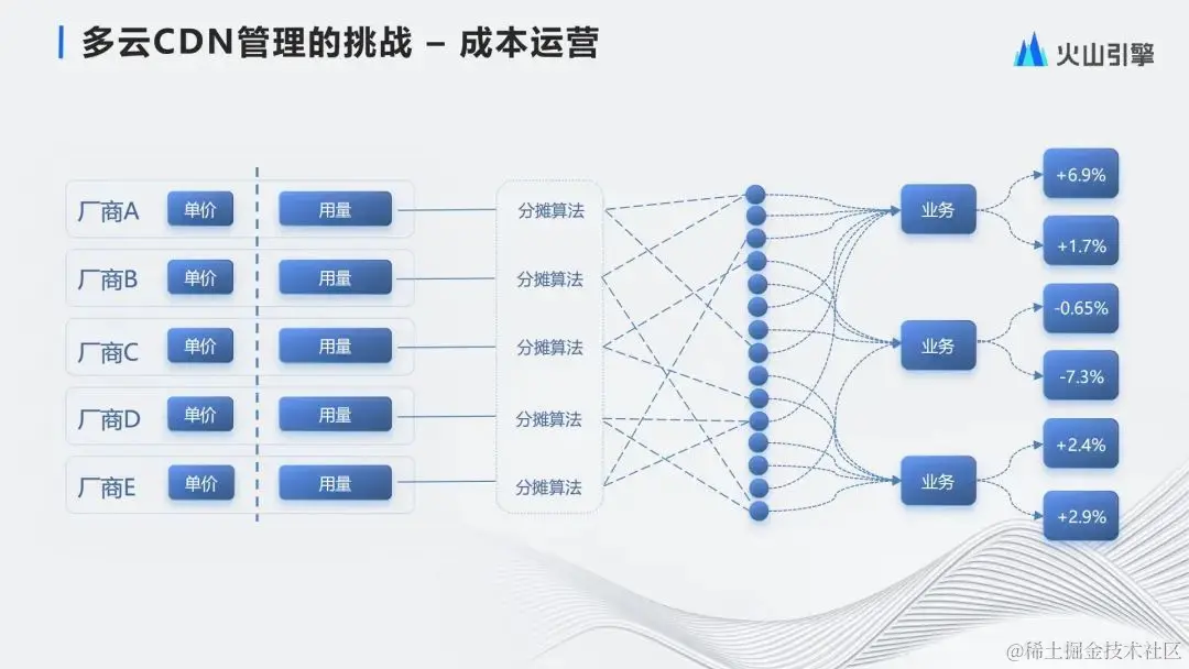 价格方面也有多厂商的考虑,价格并不是越便宜越好。不同的业务对于质量的要求是不同的,有些对于用户体验不敏感的业务会更关注成本,对质量的要求就没有那么高;另一部分业务为了更好的质量,就对价格容忍度更高一些。平台需要价格和质量层面为不同的业务找到不同的厂商,选出一个最合适的方案。