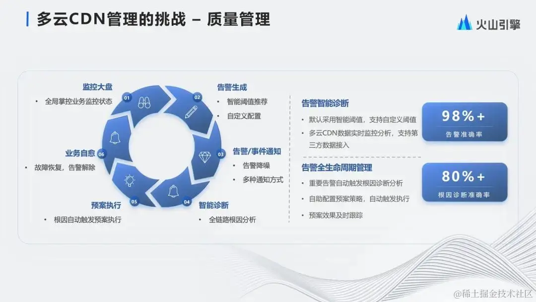 过去几年我们一直在改善闭环里的执行效率和准确性,让更多的问题能够被自动预案来覆盖。目前的告警准确性,就是那些波动异常经过智能阈值判断,以及降噪处理后,被确认真的是异常的占了98%以上,80%以上的告警会带着准确的根因分析信息一同提供给SRE和技术支持的同事。