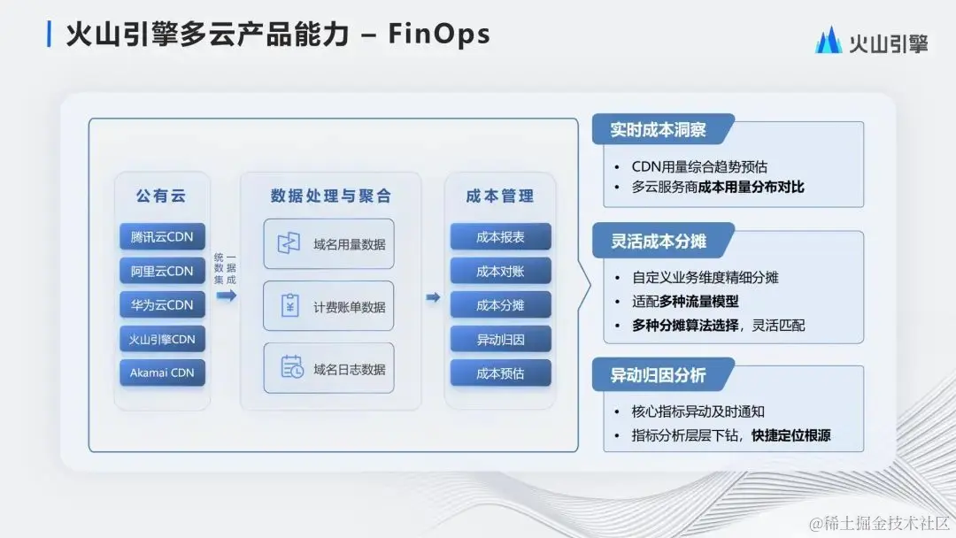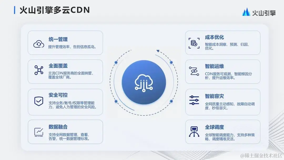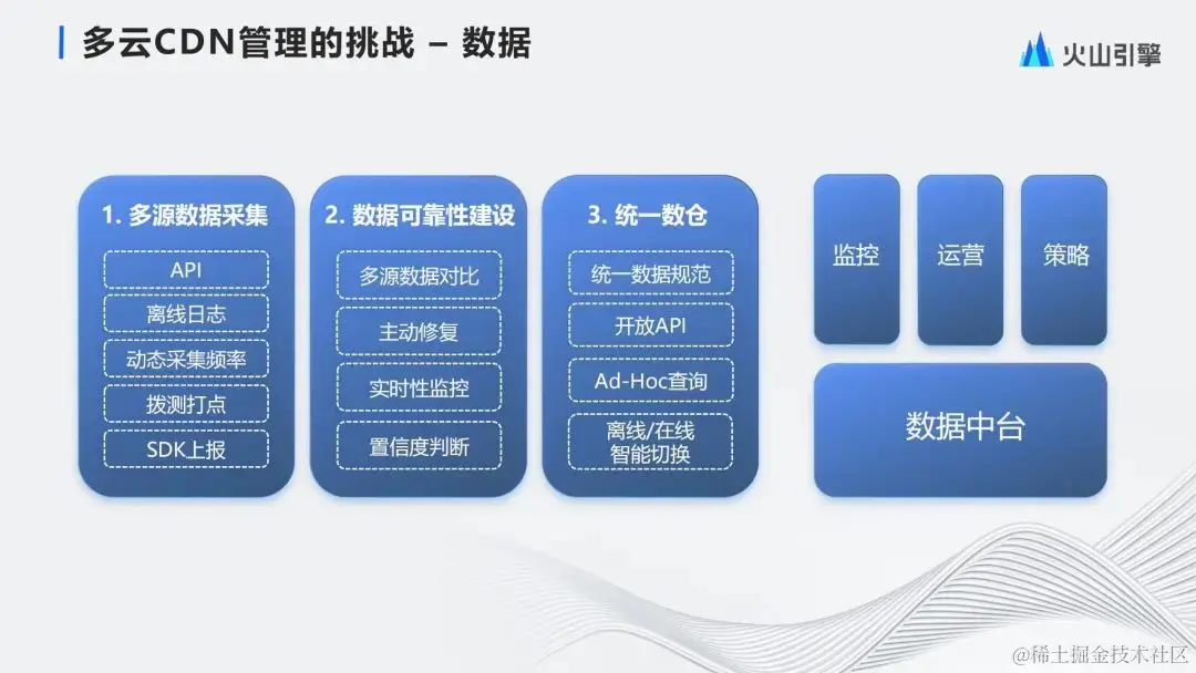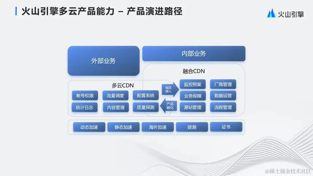 所以在去年我们对系统又重新做了一次改造,把底层的关键能力,数据系统配置系统调度系统还有中间的一些核心解决方案,逐步的开放成我们的产品能力,放到火山引擎上面提供出来。这个就是我们的多云CDN产品。