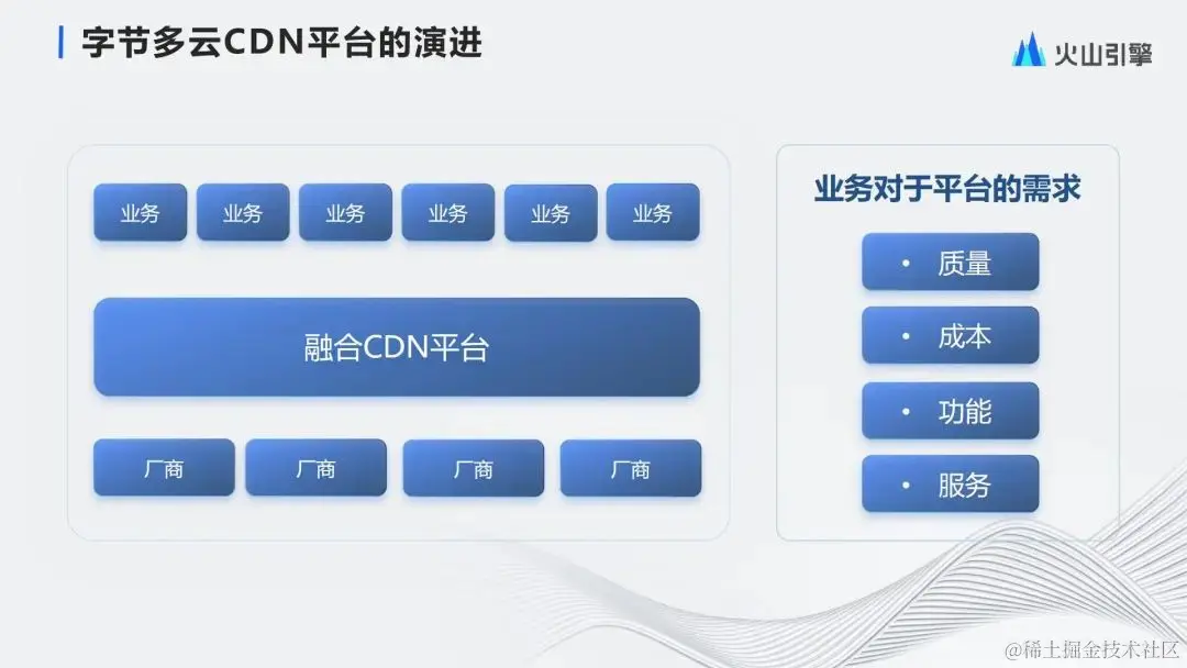 第三个诉求是功能:不同业务有比较大的差异的,比如访问鉴权、回源rewrite,缓存时间等。每个业务都会有自己的设计和需求,作为融合平台需要理解这些设计的差异,然后将它转换成厂商可满足的服务需求,最后实现、验证、最后交付给业务方;