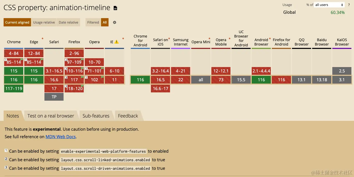 来看看 CSS Scroll Driven 相关的 API 目前的兼容性如何?截止至 2023-09-09,基于 Can i Use - Animation-timeline 的兼容性如下: