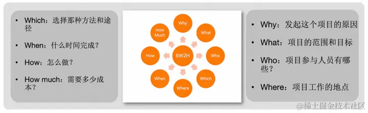 每个项目都有独特性、临时性、目的性。那么如果找到项目的目标,可以考虑用 6W2H 思考法。
