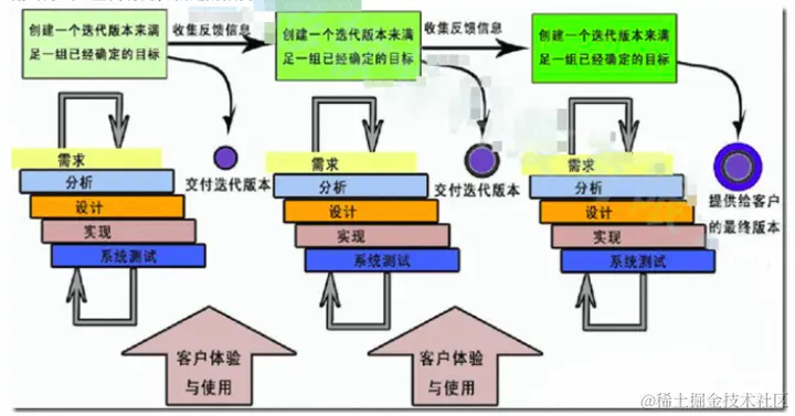 迭代模型出现时间也比较早,早期被称之为 “分段模型(stagewise model)”。从一定程度来说每次迭代开发都是一次完整地经过所有工作流程的过程:需求分析、设计、实施和测试工作流程,也可以说是小型的瀑布式项目组合。这种分割的好处也显而易见,就是阶段目标可检验。