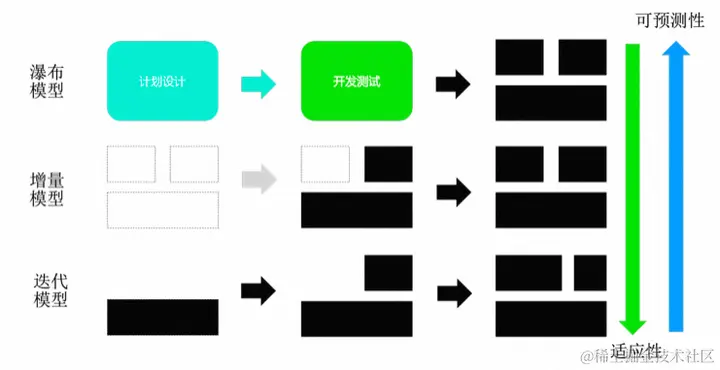 除了上述三种经典模型外,还有螺旋模型,演化模型、模型模型等,其他模型基本是这三种模型上的强化或调整,从事软件开发核心掌握着三种模型即可,我们用一张图对比三种模型的差异。