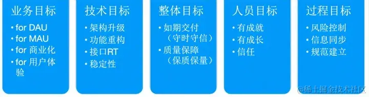 初次做项目 PM 的时候,很容易把项目目标设定为某某日期按时上线或者无故障发布等等。按时上线是非常重要的一环,但这里面缺乏对质量的要求,对性能的要求,也无法体现团队人员的成长等等。设定目标时,不要从单一维度出发我们要从多维度出发,设定目标要具备 SMART 原则,即目标具体、可衡量、可实现。如下例所示,右侧项目的目标设定明显要好于左侧。