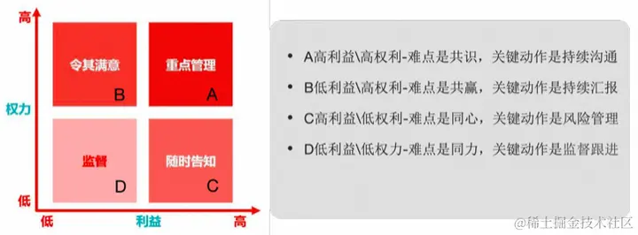 做好干系人管理明确他们的诉求后,那么就知道 AB 方格干系人的目标一定要作为项目核心目标来定义,并与他们做好充分沟通确认,C 的目标作为重要支撑目标来定义。