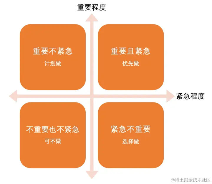时间管理的核心是精力管理,每个人的精力都是有限的,要把自己的精力用在重要的事情上,这样产出才是高效的,作为项目中心的 PM,项目的大小变化都会汇聚到项目 PM 这边来,可以通过紧急重要四象限来管理所有事项,并按照事项所在象限,分配时间精力来做。