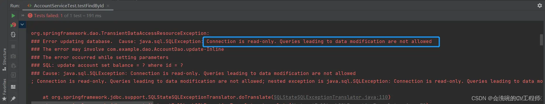 这里我们对查找用户id的时候进行用户修改,看看测试的时候是否报异常,因为上面我们已经设置了find方法开头为只读事务,不能对数据进行修改