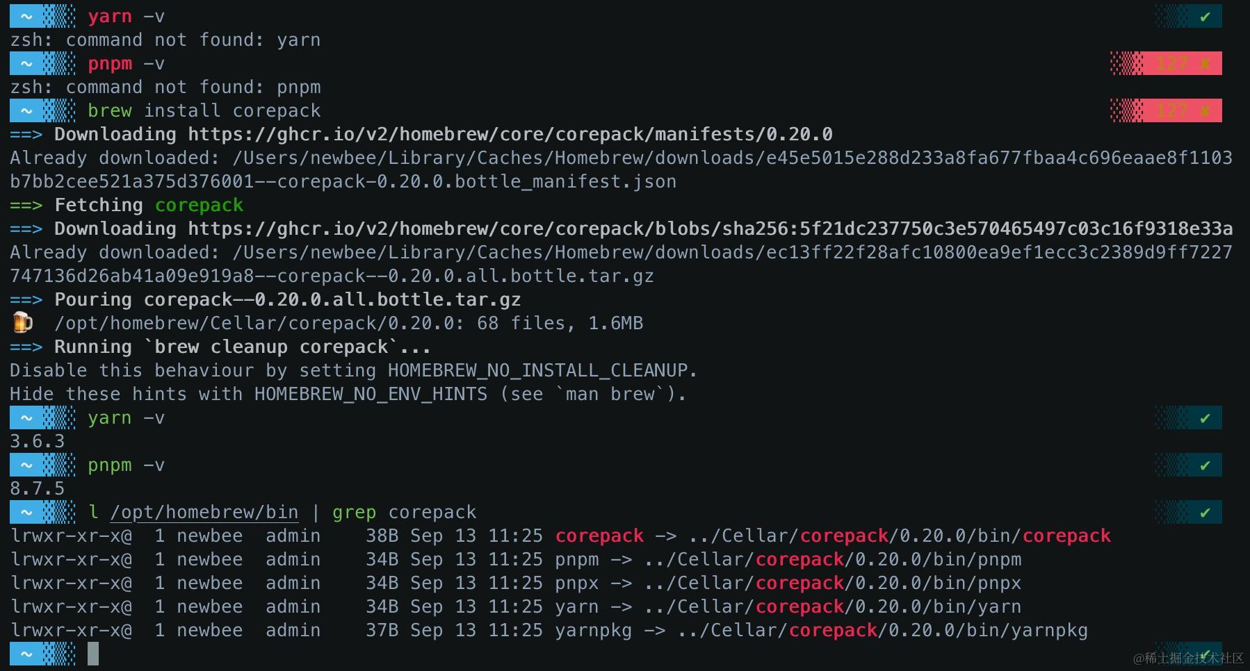 需要注意的是,brew install 的 node 是没有 corepack 的,需要单独安装: