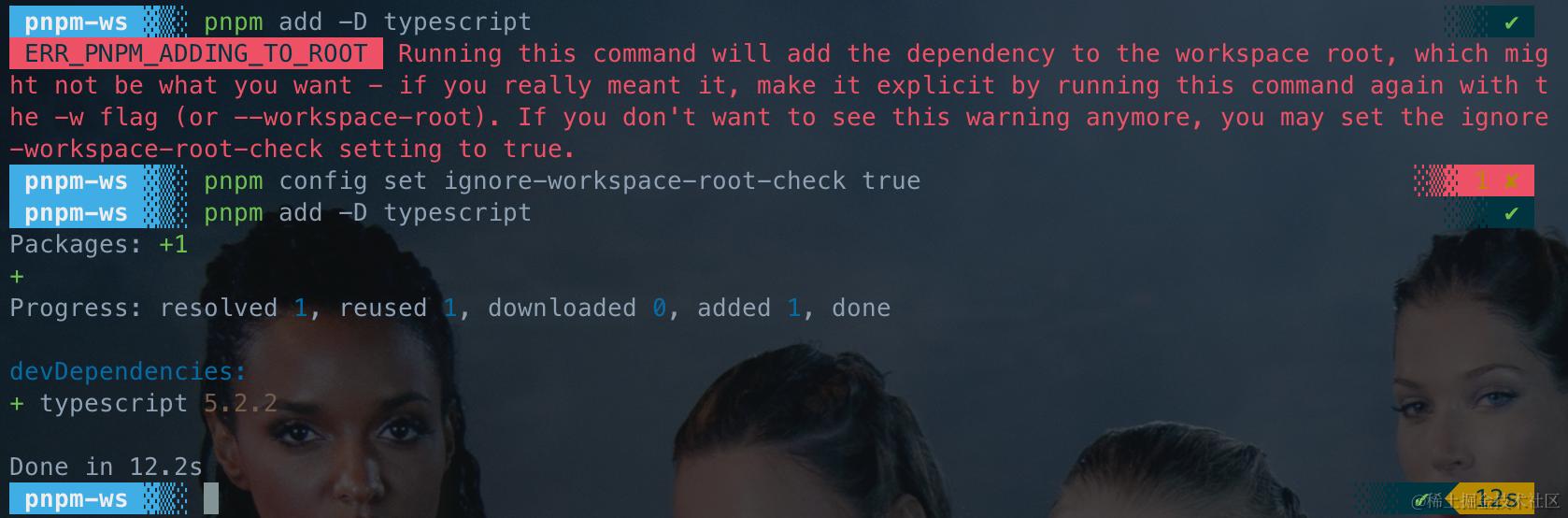 在 Workspace 下,不加 -w 报错,要么加上,要么执行 pnpm config set ignore-workspace-root-check true 修改默认行为。