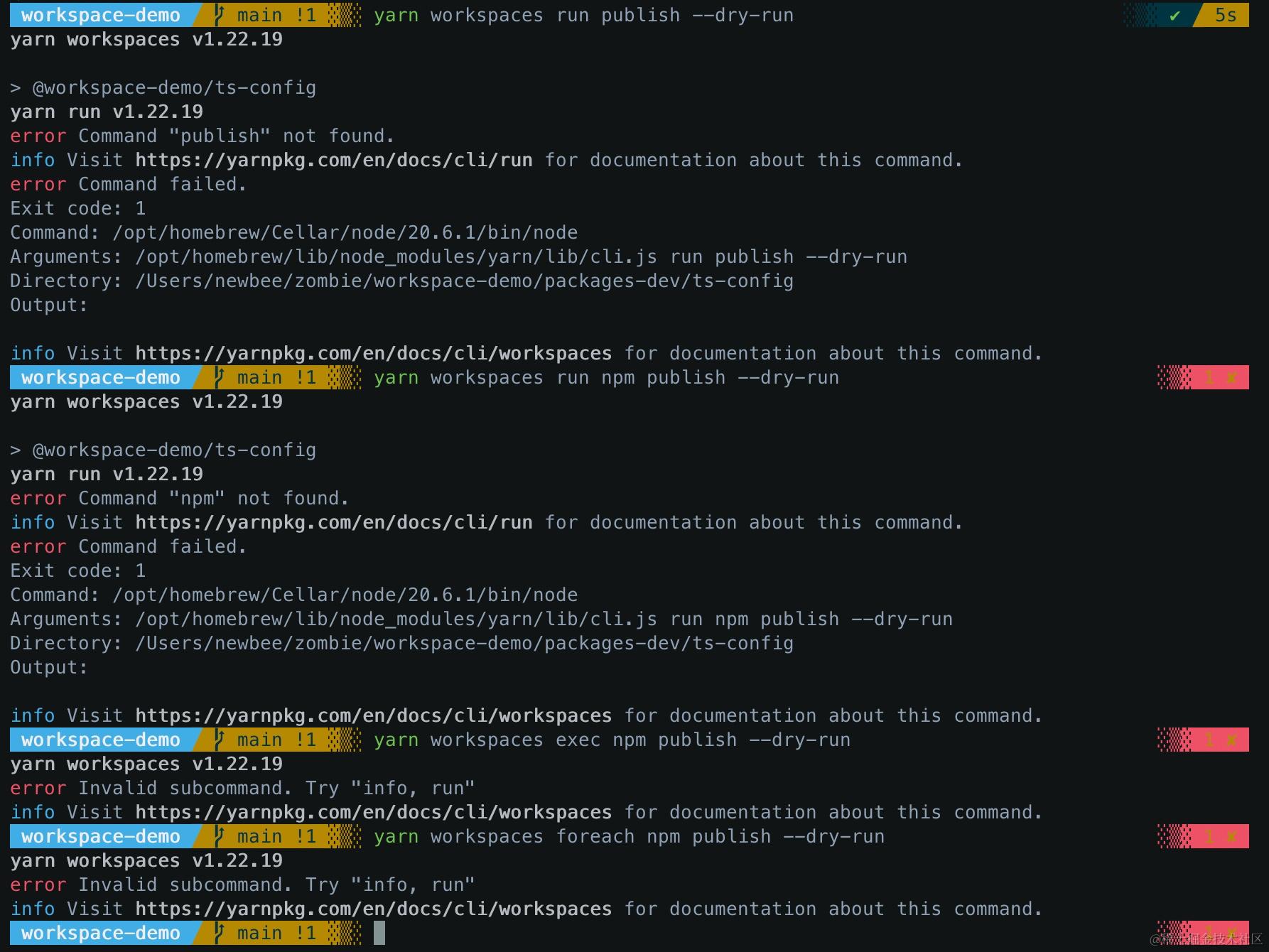 之所以提 corepack 是因为,yarn 的版本,只有它可以安装到最新的 3.x。然而💥,我试了无论 v1、v2 还是 v3,yarn 都没有支持 yarn workspaces foreach。而且 v3 在 install 后并不能如 1.x 那样初始化 Workspace,故此,本篇依然使用 yarn@1.x。