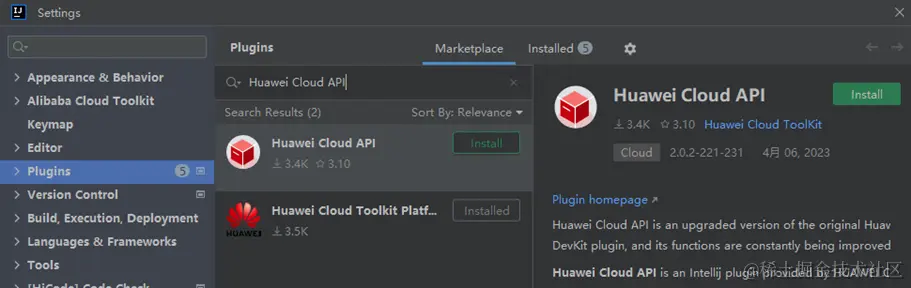 - Search Results区域会出现Huawei Cloud API,单击Install,完成后重启IDE。