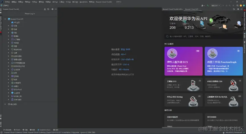 安装验证: 在IntelliJ系列平台上安装插件成功后在左侧的导航栏中可以看到Huawei Cloud Toolkit图标,点击后面板会出现Huawei Cloud API的字样,则说明安装成功。