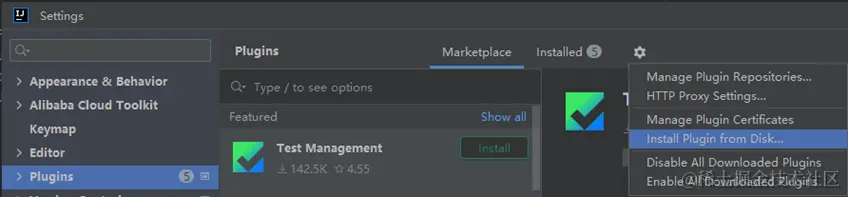 - 在Plugins区域单击 ,再单击Install Plugin from Disk...。