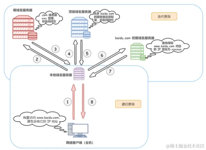 通过先后请求根域名服务器、顶级域名服务器、权限域名服务器获取到 ip 地址。