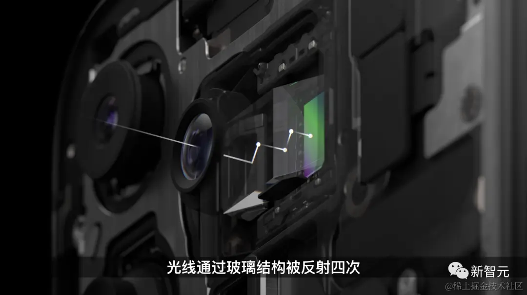 为此,苹果创新性地打造了四重反射棱镜。让光线在更小的结构中传播更长。