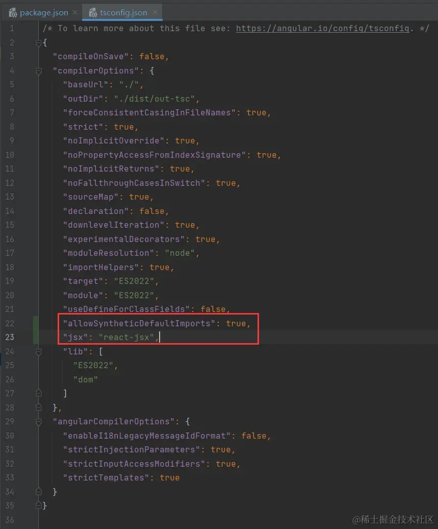 最后,在 tsconfig.json 添加两行配置以支持 tsx 与 React 模块的引用:
