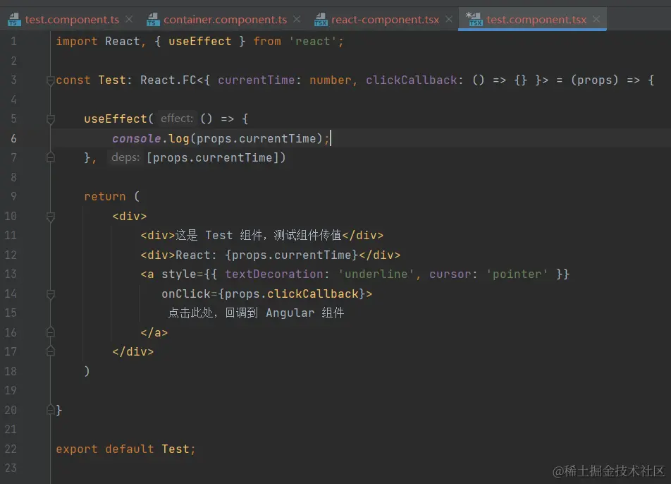 上述代码的作用是接收 TestComponent 父组件 ContainerComponent 传入的值,并将其传入到 React 子组件中,并能根据父组件 ContainerComponent 中的变化,在 React 子组件中实现响应。同时 React 子组件中有传入一个回调方法,回调至 TestComponent 组件。