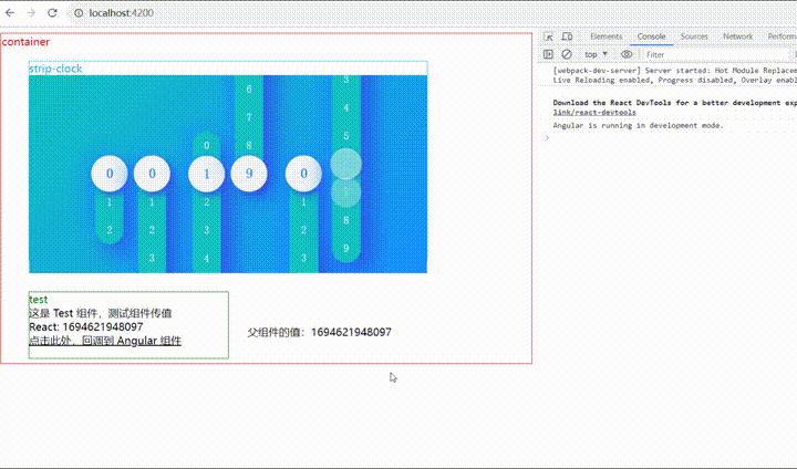 将 StripClockComponent 放入 ContainerComponent 中,就能看到 React 组件正确地在 Angular 中显示出来了: