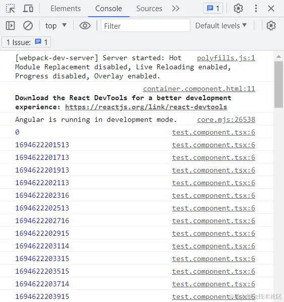 可以看到,ContainerComponent 组件中的 currentTime 通过 TestComponent 传入到 React 子组件中,更新该值的同时, React 能正确响应到变化。并且 React 子组件的点击事件也能正确回调到 Angular组件。