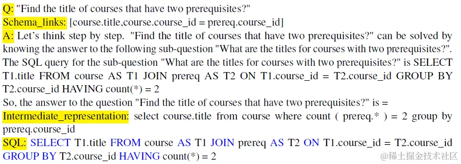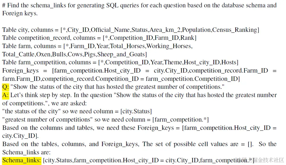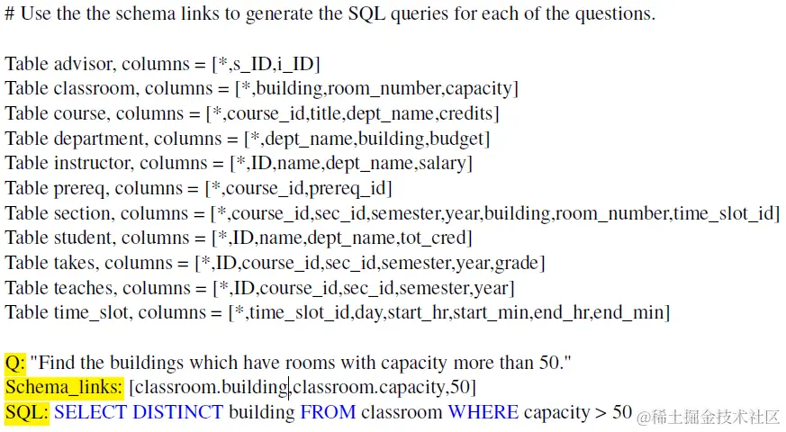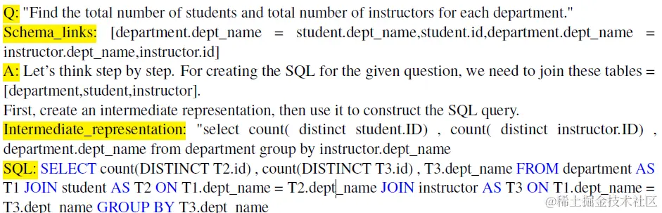 - Medium:表结构和schema Link同上,指令加入了zero-shot的思维链激活,思维链每一步对应SQL sub query。But这里有些奇怪的是论文中Medium部分的few-shot很多也是单表查询不需要join的,困惑脸......