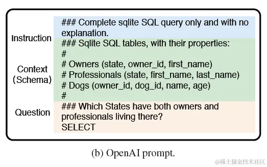 C3也通过Schema Linking先定位问题相关的数据表和查询字段。不过在指令构建上,论文认为在编写指令时,简洁的文本格式(clear layout),以及不引入不相关的表结构(clear context),会降低模型理解难度,对模型效果有很大提升。下面我们分别看下这两个部分